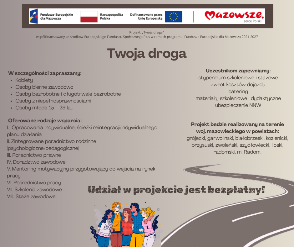 Marcin Rokoszewski ,,MARSOFT” wraz z partnerem Fundacją Zarządzania i Innowacji serdecznie zapraszają do udziału w projekcie pt. „Twoja droga” nr FEMA.08.01-IP-039M/24 realizowanym na terenie województwa mazowieckiego.